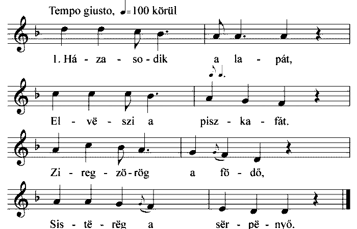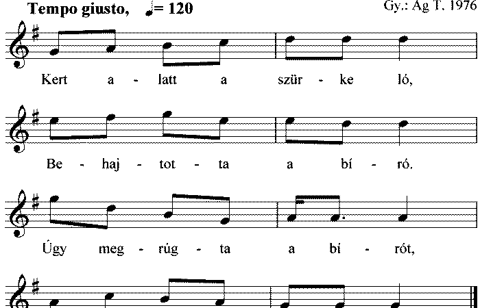 1. Kert alatt a szürke ló, Behajtotta a bíró. Úgy megrúgta a bírót, Harmadnapra meg is hót. 2. Szegény bíró,...