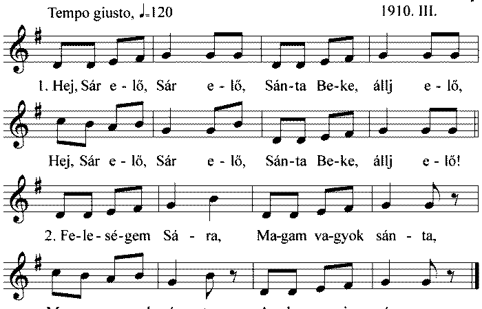 1. Hej Sár elő, Sár elő, Sánta Beke, állj elő, Hej Sár elő, Sár elő, Sánta Beke, állj elő! 2....