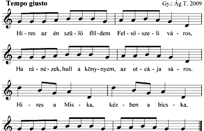 1. Híres az én szülőföldem Felsőszeli város, Ha ránézek, hull a könnyem, az utcája sáros. Híres a Miska, kézben a...