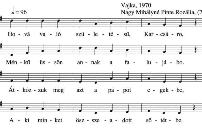 Hová való születésű Karcsáro (ének, Felnőttek népdalai, tréfás, gúnyos dal)