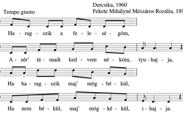 Haragszik a feleségöm, Azér’ támadt kedvem néköm, tyuhajja, Ha haragszik maj’ mögbékül, Ha nem békül, maj’ mögkékül,ihajja. Azért, hogy én...