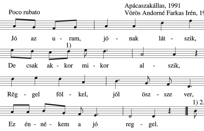 Jó az uram, jónak látszik, De csak akkor mikor alszik, Rëggel fölkel, jól összever, Ez énnékem a jó reggel. Ki...