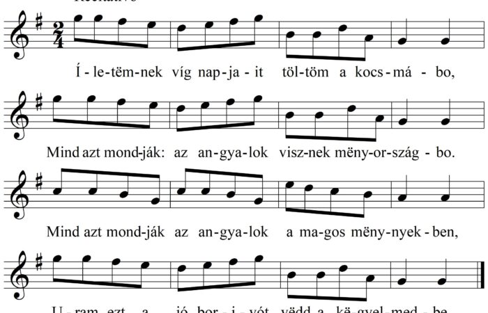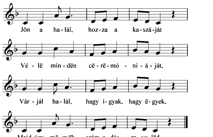 Jön a halál, hozza a kaszáját Vélë mindën cërëmóniáját, Várjál halál, hagy igyak, hagy ëgyek, Majd úgy mëgyëk, számadásra velëd.