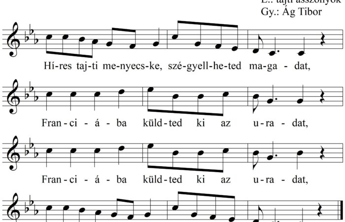 1. Híres tajti menyecske, szégyellheted magadat, Franciába küldted ki az uradat, Franciába küldted ki az uradat, Határőrrel biciklin hurcoltattad magadat....