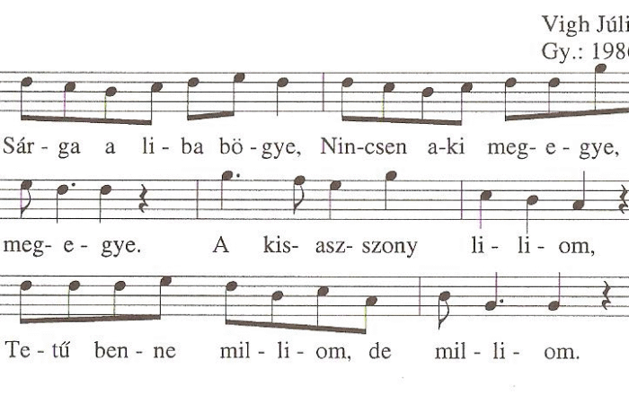 Sárga a liba bögye,Nincsen aki megegye, de megegye.A kisasszony liliom, Tetű benne milliom, de milliom.
