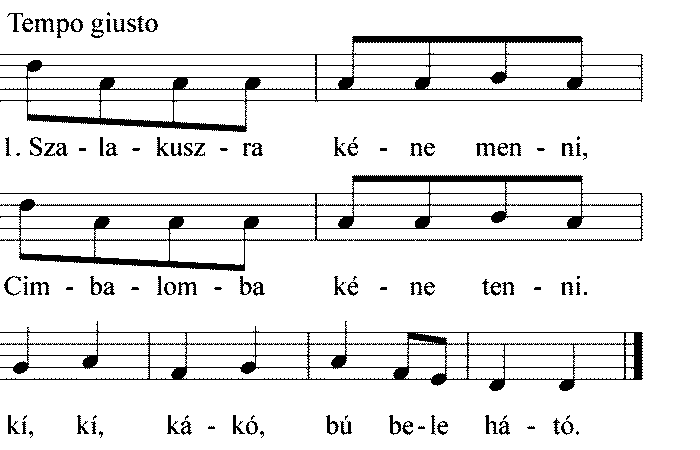 1. Szalakuszra kéne menni, Cimbalomba kéne tenni, Kí, kí, kákó, bú bele hátó. 2. Árokparton szól a haris, Megfogom a...