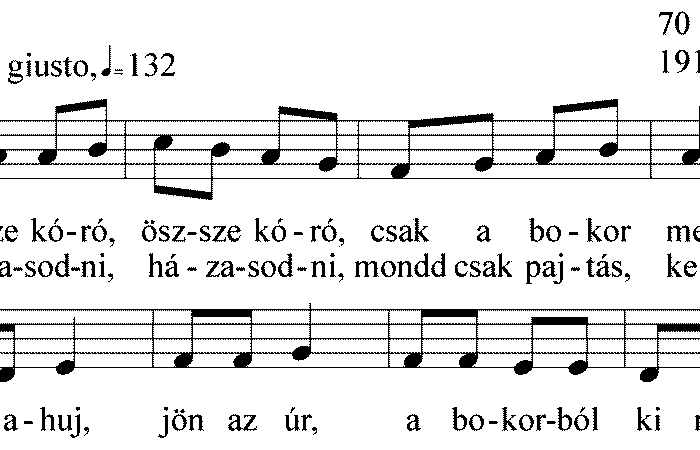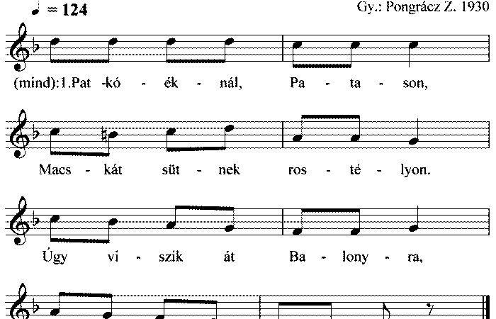 (mind): 1. Patkóéknál Patason, Macskát sütnek rostélyon. Úgy viszik át Balonyra, A nagy lakodalomra. (legények): 2. – Vereknyei laposon Leesett...
