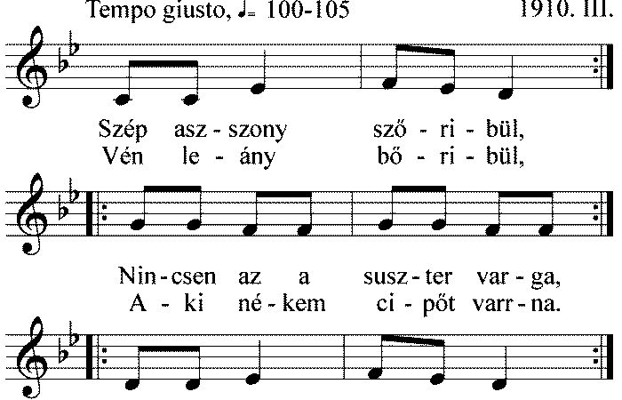 1. Szép asszony szőribül, Vén leány bőribül, Nincsen az a suszter, varga, Aki nékem cipőt varrna. Pénteken, szombaton. 2. Igyál...