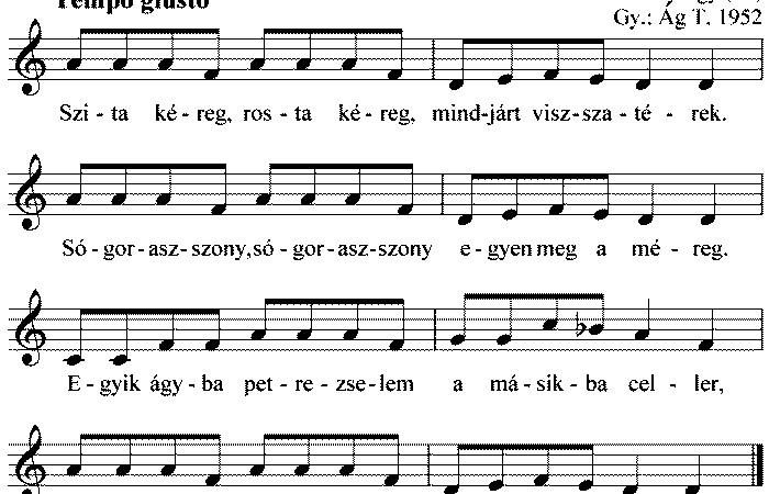 Szita kéreg, rosta kéreg, mindjárt visszatérek. Sógorasszony, sógorasszony, egyen meg a méreg. Egyik ágyban petrezselem, a másikban celler. Kocsmárosné szolgálóját...