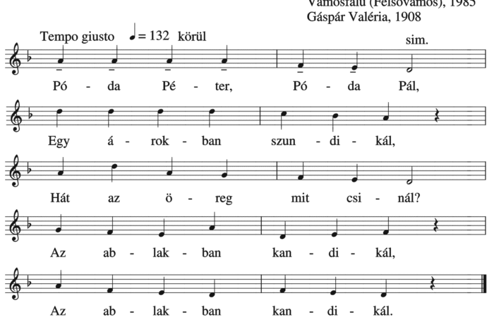 Póda Péter, Póda Pál, Egy árokban szundikál, Hát az öreg mit csinál? Az ablakban kandikál, Az ablakban kandikál. Kert megetti...