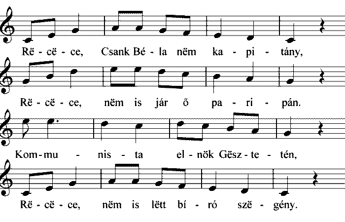 Rëcëce, Csank Béla nëm kapitány, Rëcëce, nëm is jár ő paripán. Kommunista elnök Gësztetén, Rëcëce, nëm is lëtt bíró szëgény.