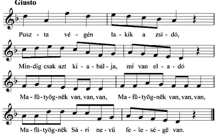 Puszta végén lakik a zsidó, Mindig csak azt kiabálja, mi van eladó. Mafütyögnëk van, van, van, Mafütyögnëk van, van, van,...
