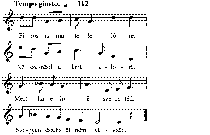 1. Piros alma telelőrë, Në szerësd a lánt előrë. Mert ha előrë szeretëd, Szégyën lësz, ha ël nëm vëszëd. 2....