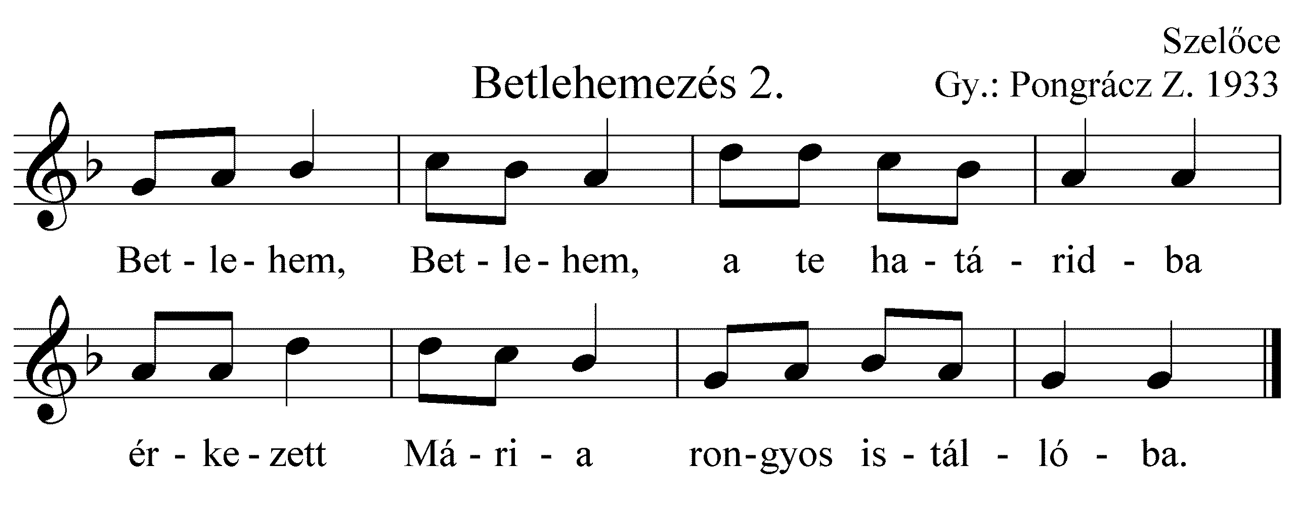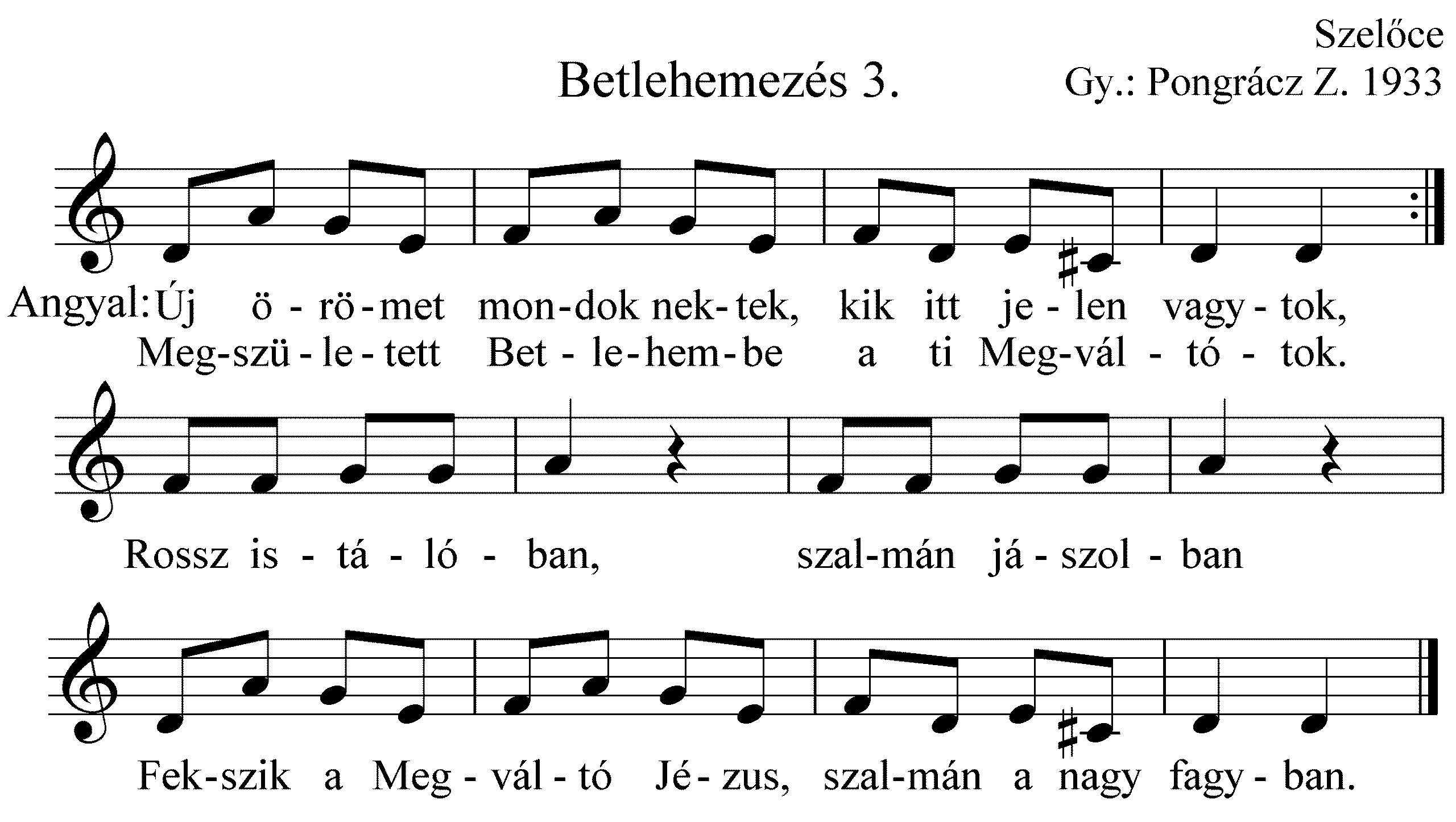 Betlehemes: Júda Betlehemében, Dávid városában megszületett a kis Jézus rongyos istállóban, pólyába takarva. És pásztorok valának ama vidéken, őrtállván az éjszakában nyájuk mellett. Egyszerre csak nagy fényesség lőn, megjelent az Úr angyala és így szólott hozzájuk: Ne féljetek pásztorok, örömet hirdetek néktek: megszületett a kis Jézus Dávid városában! Rongyokba csavarva, jászolba fektetve Betlehem határában….