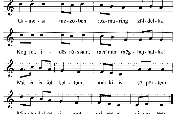 | Megjegyzés | Szintén egy olyan dallam és szöveg, amelyet a 20. század második felében már nem ismertek Gímesen. 1906-ban az akkor 65 éves Molnár Klára énekelte. Lehet, hogy ez is egy más dallammal élt tovább, akárcsak az előző. Mit tudunk a dallamról? A MNT X. kötetében a 108. szám alatt közölték. 12 szótagú parlando rubato típus. Jellemző záróhangja az 5 (4) 5. Főleg Magyarország északi részén elterjedt. Kevesebb adat ismert a Palócföldről, továbbá Hont és Nyitra vidékéről. Több helyen ballada szöveget énekelnek rá. Két Nyitra-vidéki változata került elő Menyhéről és Vicsápapátiból, mindkettő ballada. |