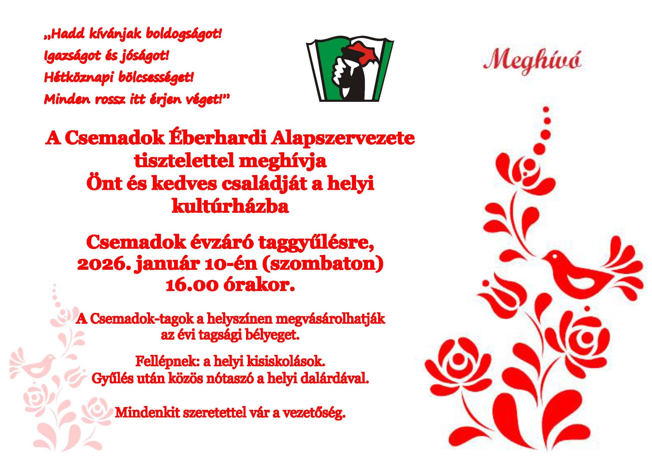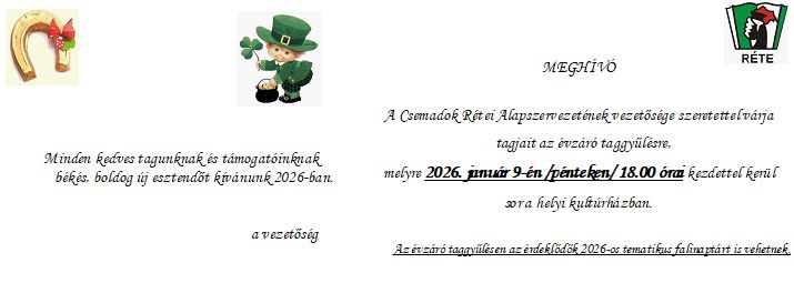 A Csemadok Rétei Alapszervezetének vezetősége seretettel várja tagjait az évzáró taggyűlésre. |