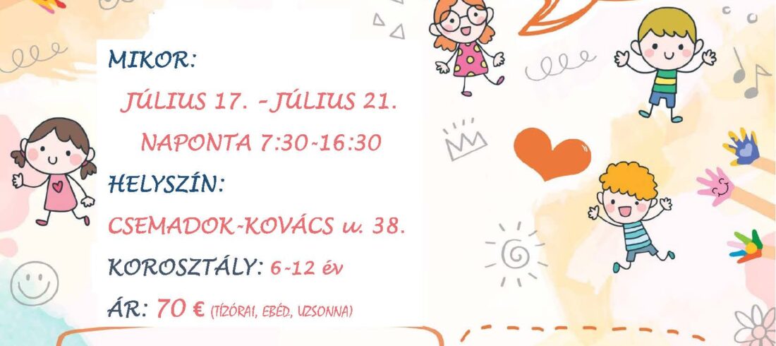 Helyismereti gyerektábor Időpont: 2023. július 17-21. között, minden nap 7:30-tól 16:30-ig Helyszín: Csemadok, Kovács utca 38. Ajánlott korosztály: 6-12 év Programok: kézműves foglalkozások, játékos foglalkozások, múzeumlátogatások és helyismereti vetélkedők a […]