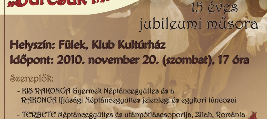 A Rakonca Néptáncegyüttes 15 éves jubileumi műsora, 2010. november 20-án, szombaton, 17.00 órakor a Füleki Klub Kultúrházban.
