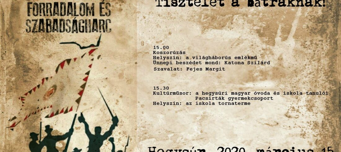 A Csemadok Hegysúri Alapszervezete tisztelettel meghívja Önöket az 1848-1849-es magyar forradalom és szabadságharc emlékünnepségére.Helyszín: az első és második világháborús emlékmű.Ünnepi beszédet mond Katona Szilárd. Szavalat: Fejes Margit.A koszorúzás és a […]