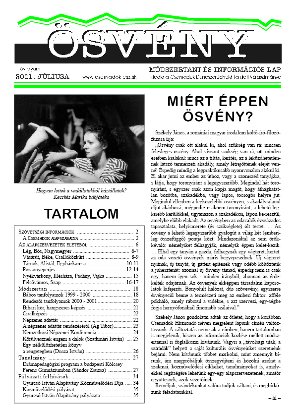 Felelős kiadó: a Csemadok Dunaszerdahelyi Területi Választmánya • A kiadásért Huszár László, a Csemadok területi választmányának titkára felel • Információs és módszertani lap, I. évfolyam (a Csemadok Hírmondó 1992-2000 utódlapja) • Megjelenik félévente • Példányszám: 500 • Megjelent 2001. júliusában • A kiadó címe: OV Csemadok, P. O. BOX 16., Trhovisko-Vásártér 825/8.,  929 01 Dunajská Streda • Telefonszám: 031/552 24 78 (egyben fax is) •  E-mail: [email protected] • WEB info: www.csemadok-dsz.sk