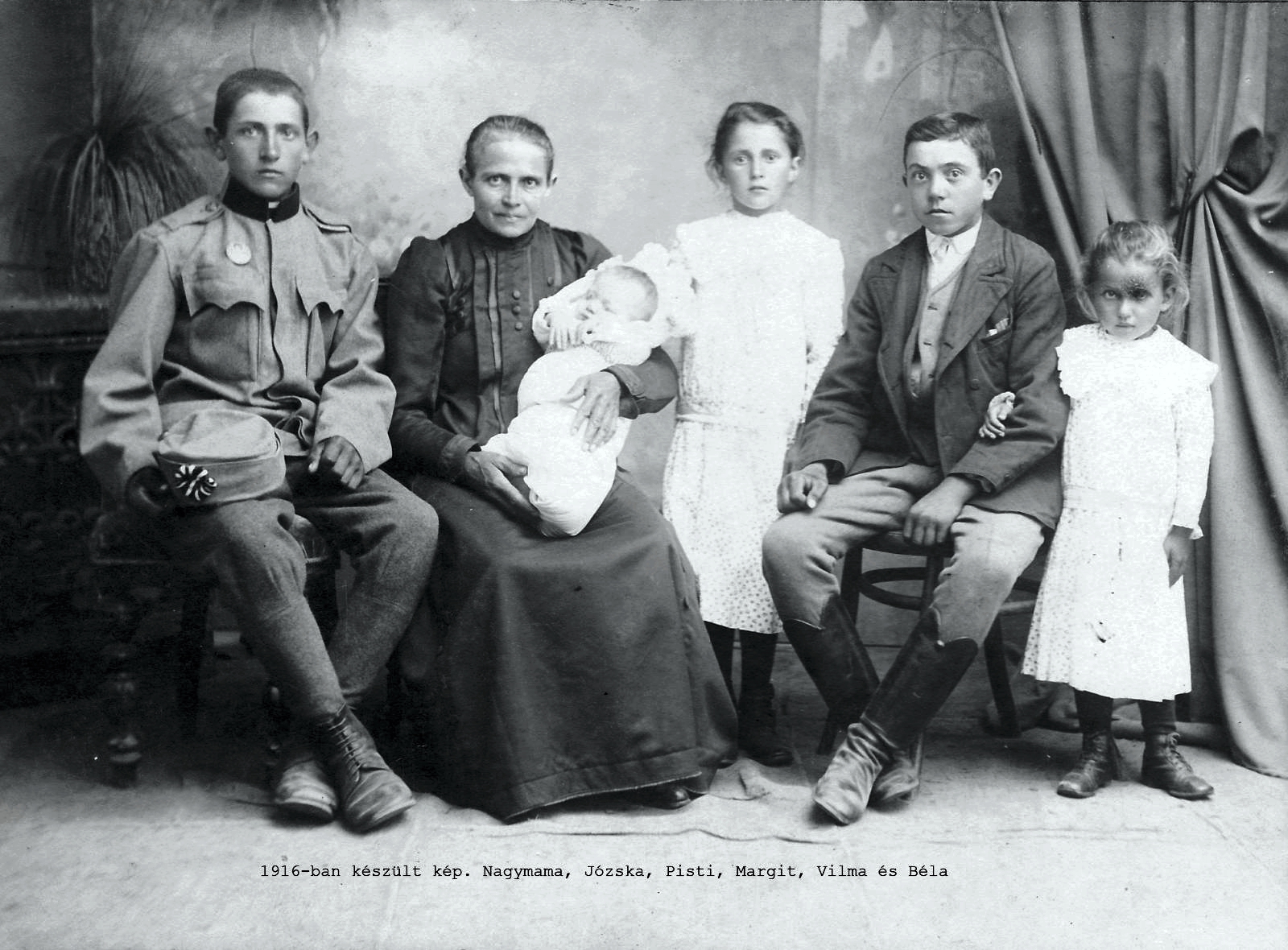 Anya: Holocsy Julianna született Kutál Julianna Csallöközcsütörtökből. Férjhez ment Holocsy Bélához, aki leesett a diófáról és meghalt. Fiuk Holocsy István misszionárius. Később férjhez ment volt férje öccséhez, Holocsy Mihályhoz. Három gyermekük született, Mária, Vilma és Béla, aki a fényképen a pólyás. Férje 1916-ban az eslő világháborúban harcolt, azért nincs a fényképen.