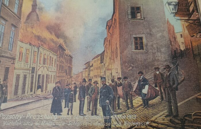 A fotót a Lovacskák csapat gyűjtötte a Felvidéki értékverseny során. Jelentősége: Az 1913-as pozsonyi tűzvész május 17-én tört ki a Váralján, a régi zsidónegyed területén. A tűz gyors terjedését a nagy meleg, az erős szél, valamint a sűrűn beépített, zsindelytetős házak segítették. A lángok rövid idő alatt több utcára is átterjedtek, miközben a helyi tűzoltók...