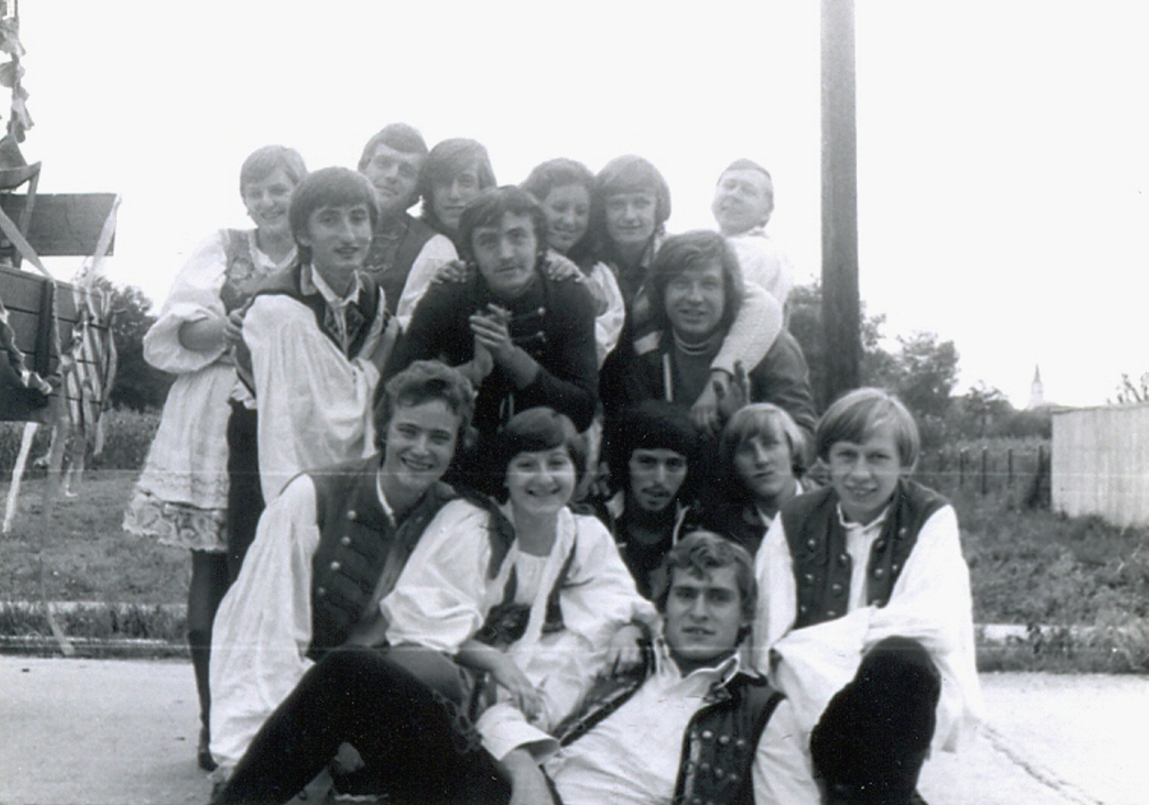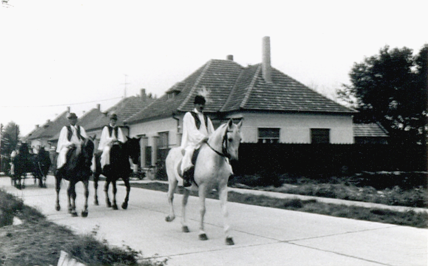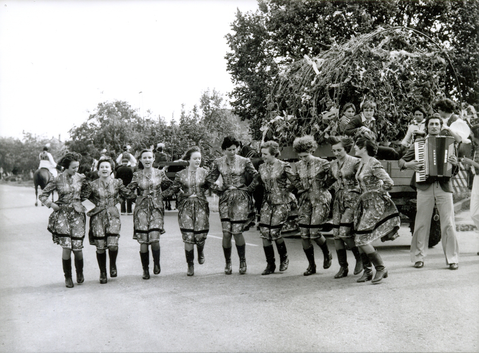A hagyományos szüreti felvonulás lényege, hogy a feldíszített kocsikon a fiatalság énekelve végigjárja a falu utcáit, néhol megállnak, táncra perdülnek s meghívják az esti mulatságba a lakosokat. A Sport utcában készült a kép, a kocsit Ledneczky Laci bácsi vezette, mert csak neki voltak vas ívei, melyeket a fiatalok indulás előtt feldíszítettek. A gyerekek kerékpáron kísérték...Read More