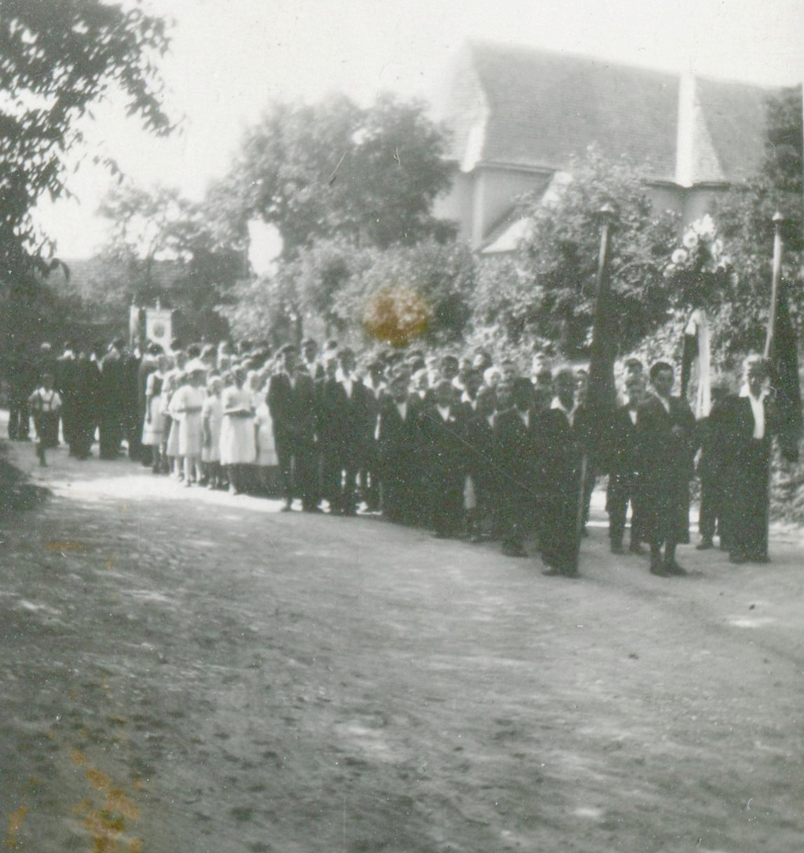 A templomi körmenetek a községben gyakoriak voltak (húsvét, búzaszentelés, keresztjáró napok, úrnap, búcsú, menet a pogrányi Jézus Szive búcsúba stb.). A képen nem állapítható meg az ünnepnap. A háttérben a templomot látjuk.Read More