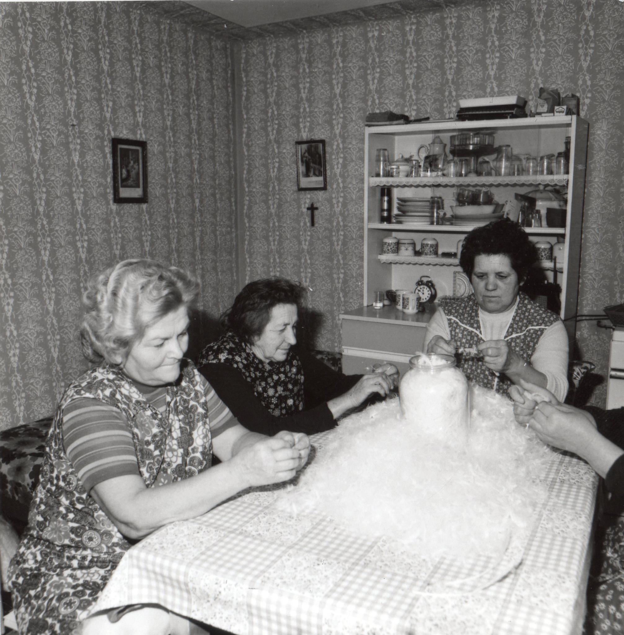 Vága, 1970-es években Az adventi időszak munkája a közös tollfosztás. Ilyenkor egy-egy háznál 20-25-en is összejöttek. Főként asszonyok, lányok. Az esténként végzett munka után pattogatott kukoricával, főtt lóbabbal, csípkával (aszalt alma), cukorrépából és céklából cukros-ecetes-köménymagos vízzel készült kompóttal, kávéval vagy teával kínálták a tollfosztókat. Az áldomásra görhönyt (kalácsféleség) készítettek. A fotón: Hornák Irma (született Forró),...Read More