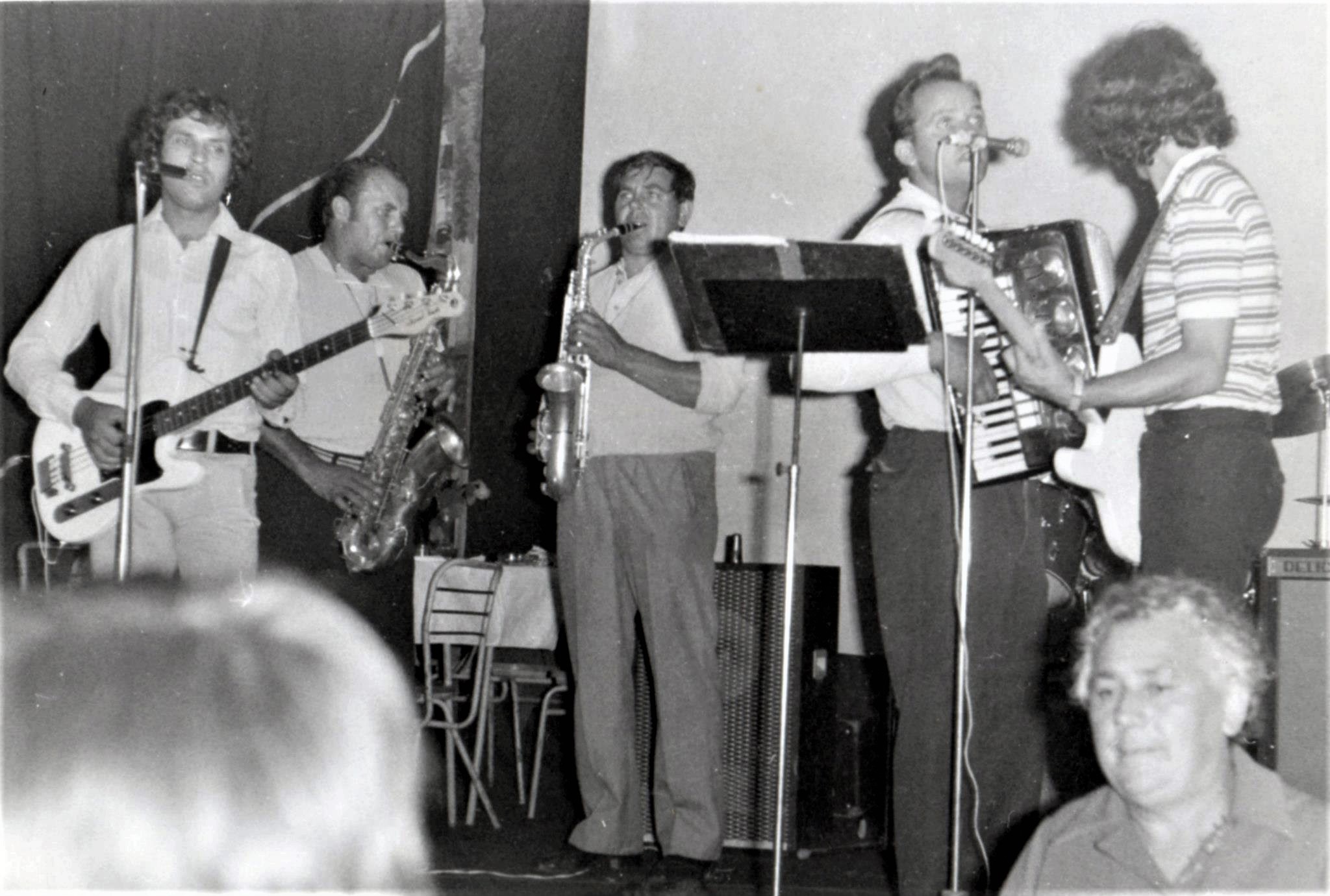 Vága, valamikor az 1970-es évek végén A Vágai Lagzis Banda együttes tagjai, balról jobbra: Németh János (basszusgitár), Farkas László (szaxofon), Knézel Ernő (dobok, szaxofon), Búčik Jozef (harmonika), Boledovics Jenő (ének, szólógitár).Read More
