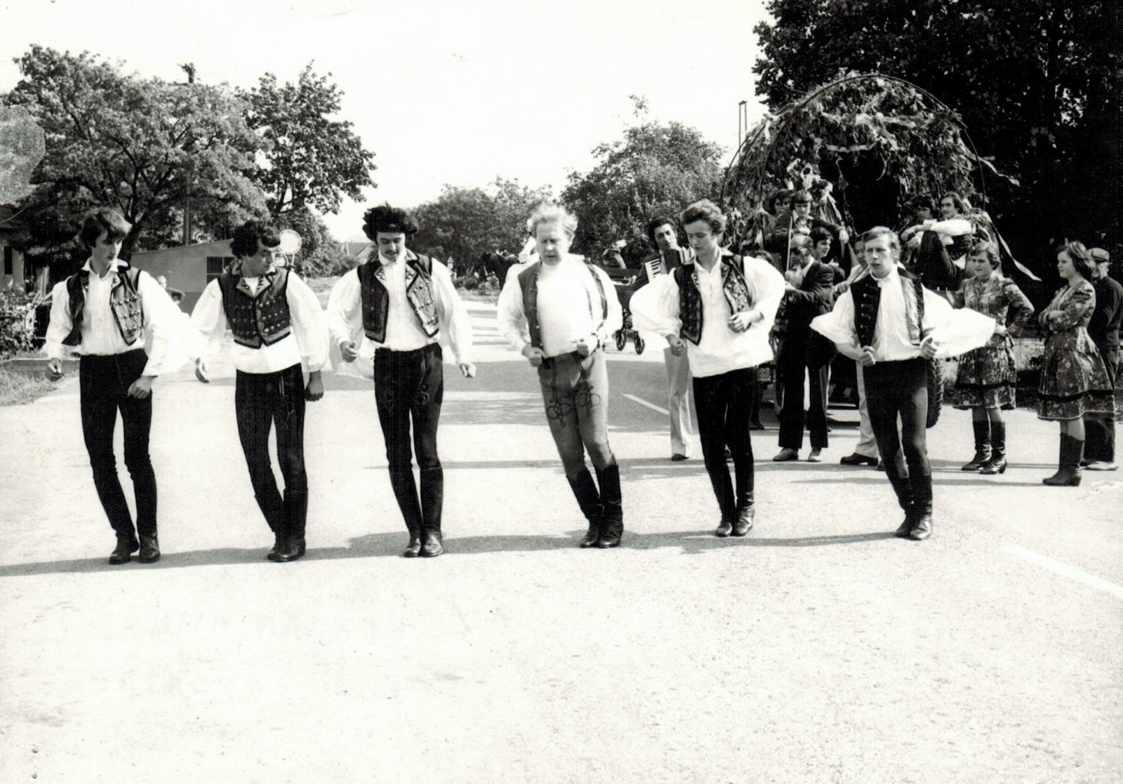 A szüreti felvonuláso Felsőszeliben a táncosok több helyen megálltak és cigányzenére táncoltak, ezzel is csábítva a lakosokat az esti mulatságba. A fiúk kapuvári verbunkját Kontár Gyula kapta lencsevégre. A kultúrház előtt az utcán táncolnak, mögöttük a menet egy része, a lányok és Jánoska Aladár bandája muzsikál. A táncosok balról: Deák Béla, Bartos László, Bartos Lajos,...Read More