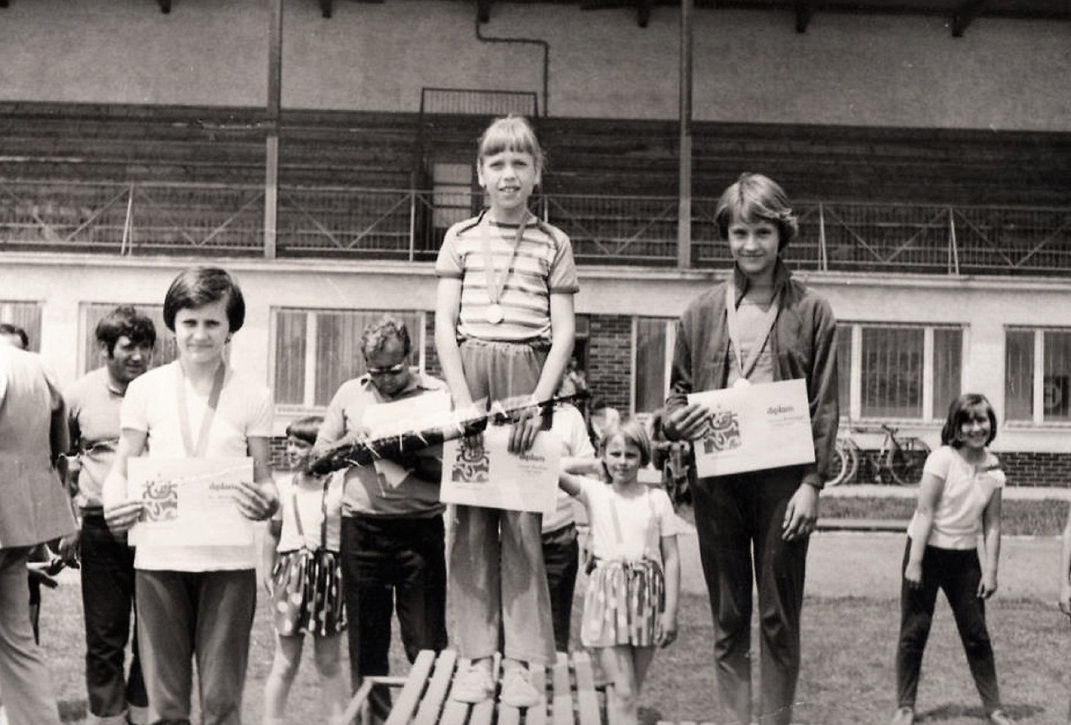 Vága, 1977. június 25. Sportnap Vágán A fotón balról jobbra: Forró József, Kotrba Mária (Sárkányné), Knézel Andrea (Obermanné), Kulcsár György, Forró Gabriella, Kulcsár Andrea (Zsigóné), Karácsony Eleonóra (Mészárosné), Jalsovszky Enikő (Miklósné).Read More
