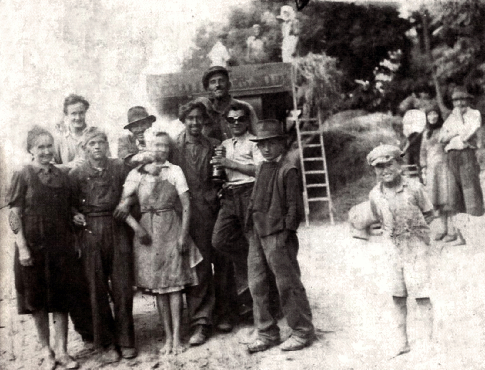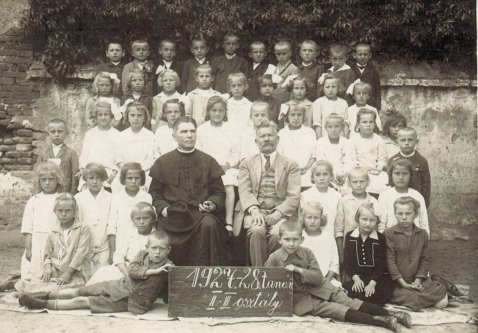 1927/28-as tanév II. és III. összevont osztályosai vannak a képen. Tanítójuk Sándor Ferenc, mellette a falu plébánosa, Boda Miklós. A katolikus iskola udvarán készült a kép, mögöttük az omladozó fal a szomszédos Szold-ház kerítése és melléképületének hátsó fala.Read More