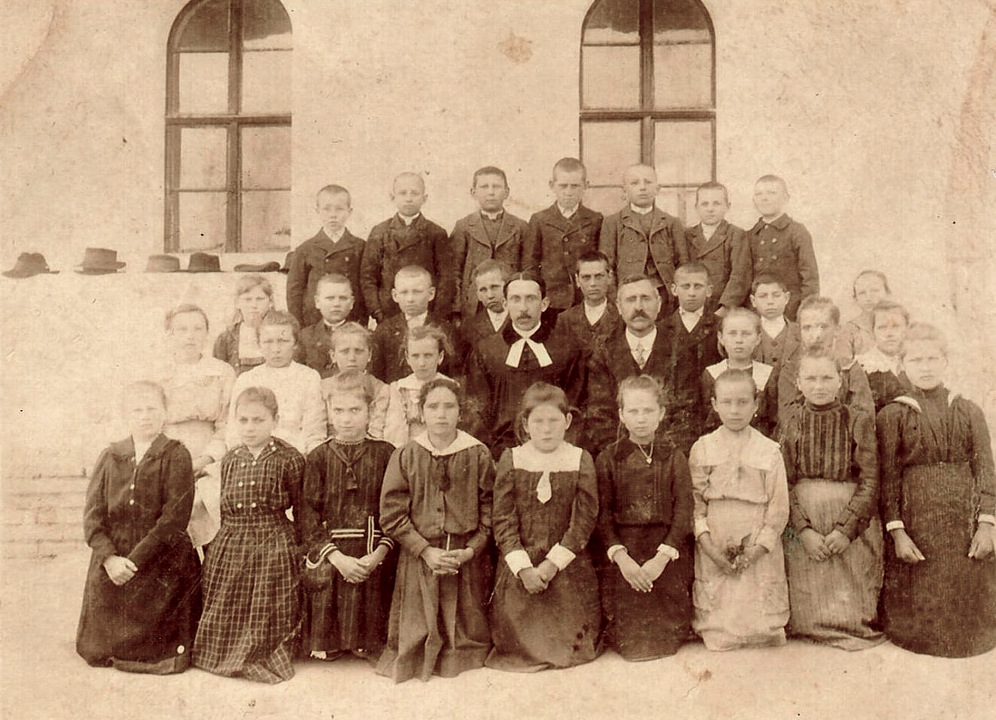 A másik felekezeti iskola, az evangélikus gyülekezet diákjai 1932-ben Endreffy János lelkésszel és id. Hasák Lajos tanítóval az iskola udvarán. A láthatóság kedvéért az első sor lányai térdelnek, a fiúk ünneplő kalapjai a folyosó falán sorakoznak.Read More