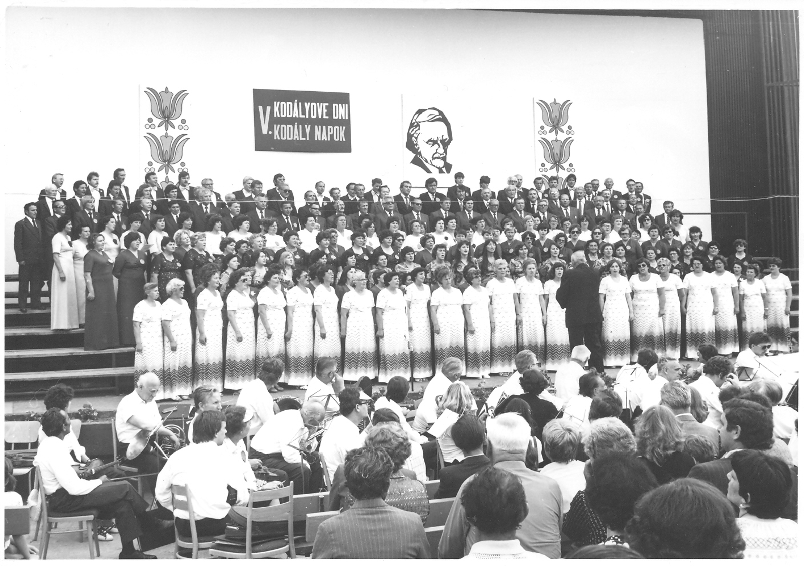 1981-ben az V. Kodály Napokon a járás énekkarai is felléptek egy népdalcsokorral és a Régi magyar diákköszöntővel. A felsőszeli vegyeskart akkor már Mészáros Magdolna vezette. A képen a népdalcsokrot a diószegi karmester, Pintér Ferenc vezényelte. A felsőszeliek az új ruhájukban, piros hosszú ruhában fehér virággal nem nagyon látszanak, mert a diószegiek takarják őket. A férfiakat...Read More