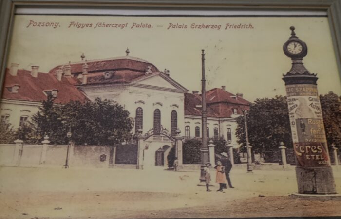 a rajz a Grassalkovics palotát ábrázolja, amit akkor még Frigyes főhercegi palotának hívtak. A jobb oldalon egy tipikus pozsonyi hirdetőoszlop található. A palota mai funkciója az éppen hivatalban lévő köztársasagi elnök elszállásolása A fotót a Lovacskák csapat gyűjtötte a Felvidéki értékverseny során.