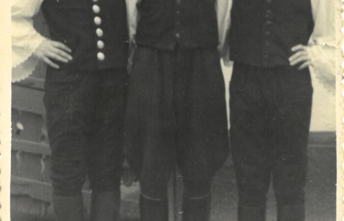 A fényképen három fiatalt láthatunk, az egyik néptáncos fellépésük után. Az 50-es években nagy népszerűségnek örvendett ez az időtöltés. A bal oldali férfit Vlacsek Sándornak hívták, aki hosszú éveken keresztül az egyik oszlopos tagja volt a csoportnak. A fotó Hetényen készült 1956-ban.