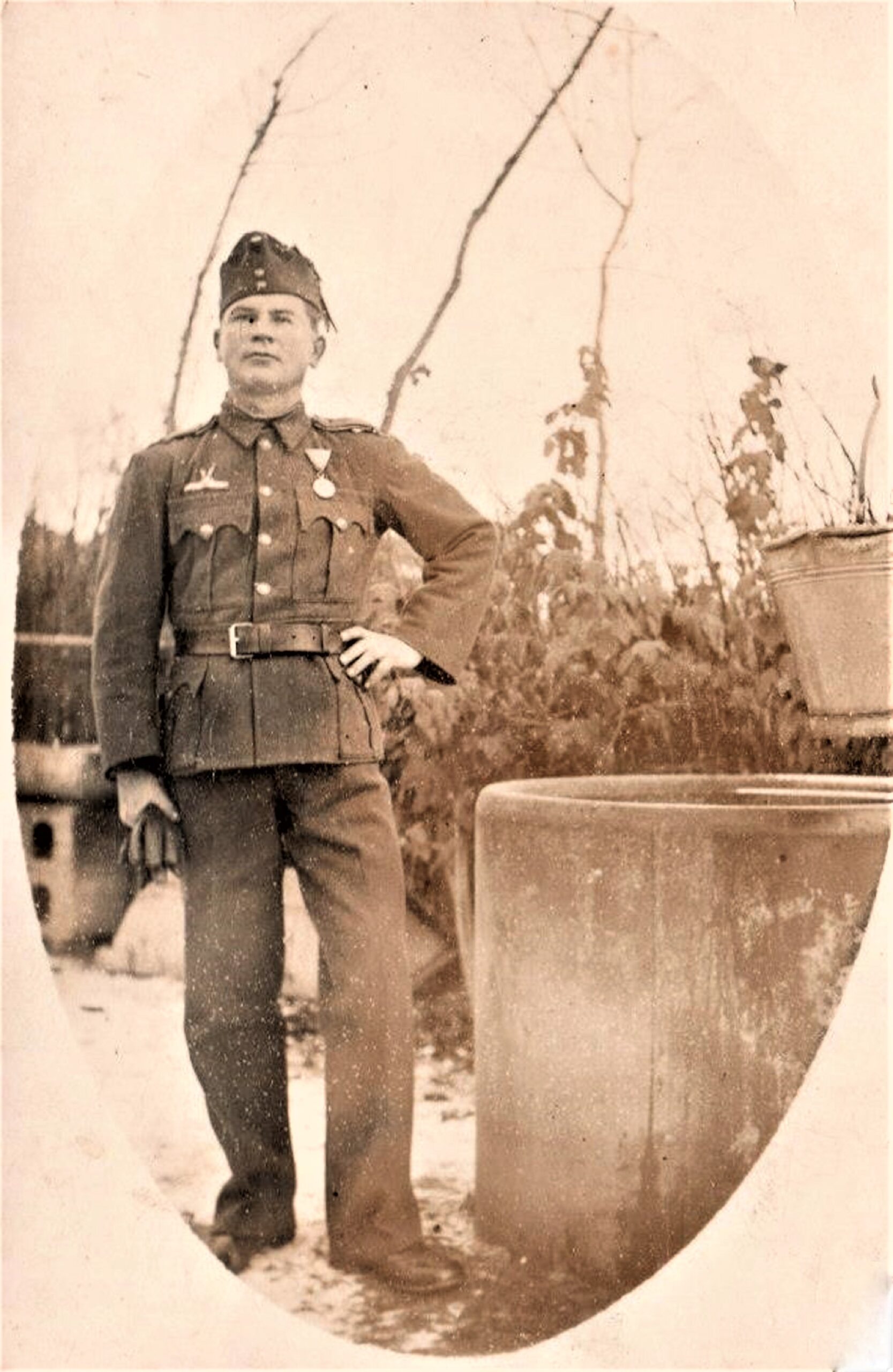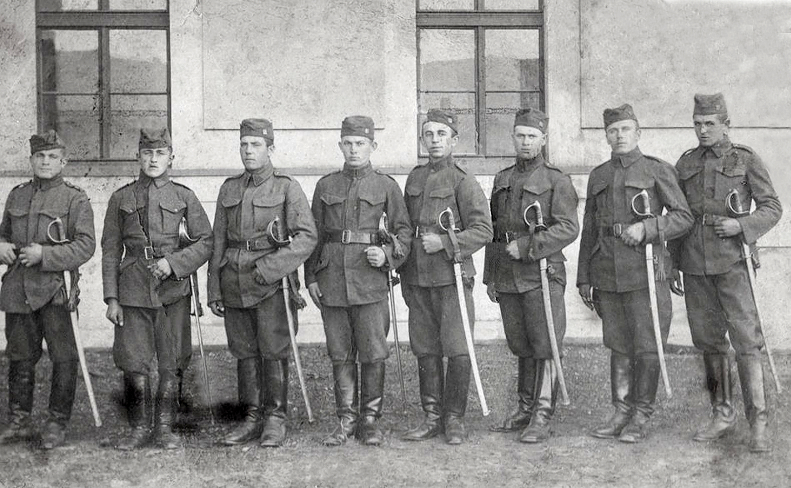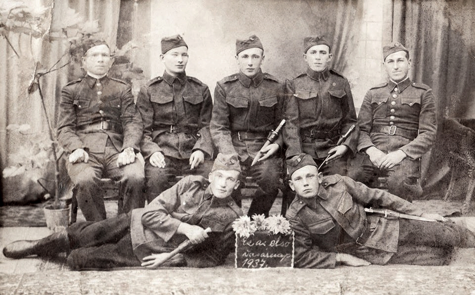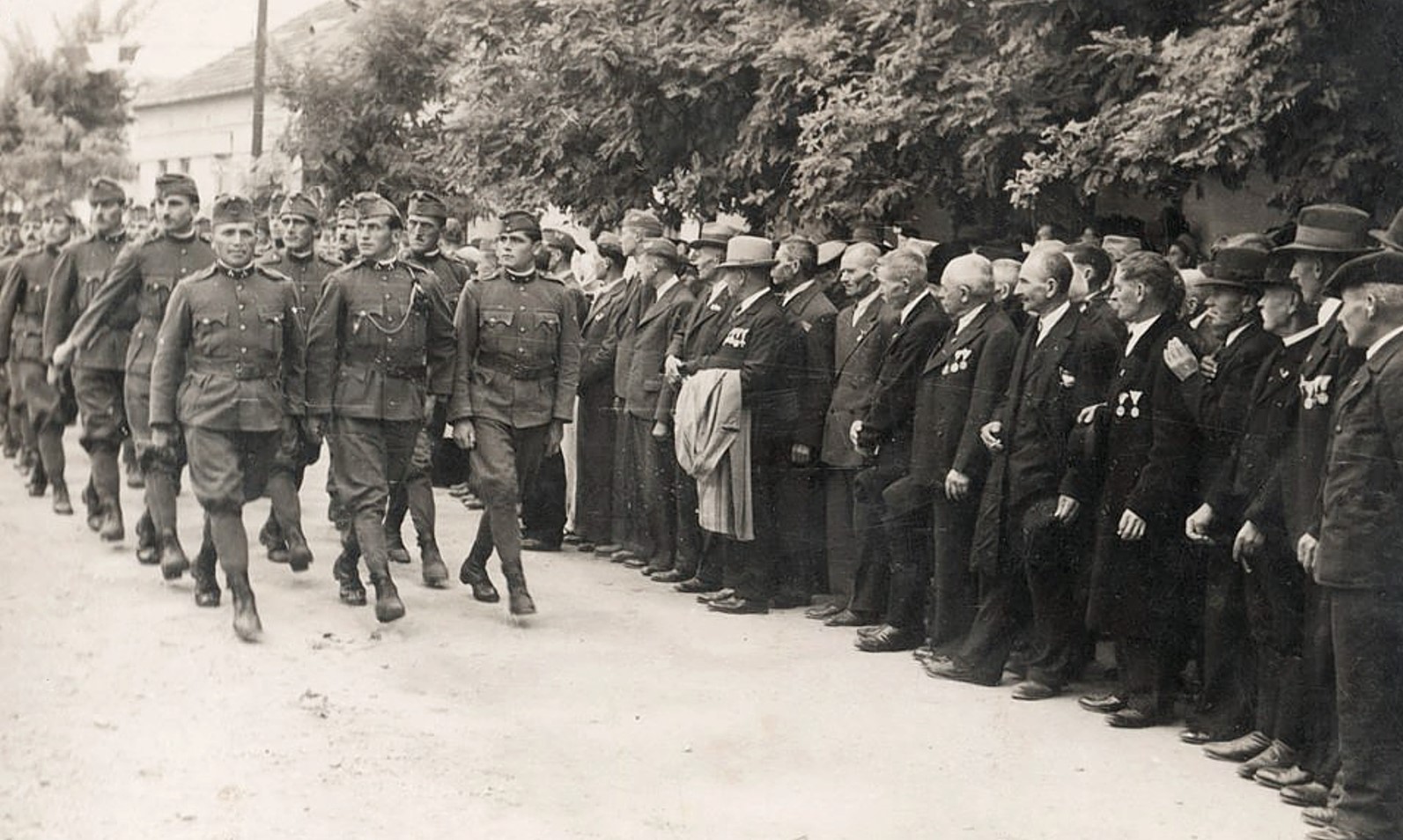 Magyarok, a csehszlovák hadseregben. Ez az első vasárnap, 1937. – olvasható a táblán. A tábla mellett a jobb oldalon, a vágai születésű (1915) Farkas István látható.Read More