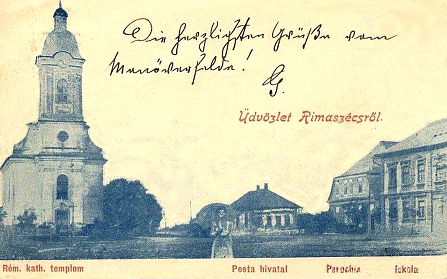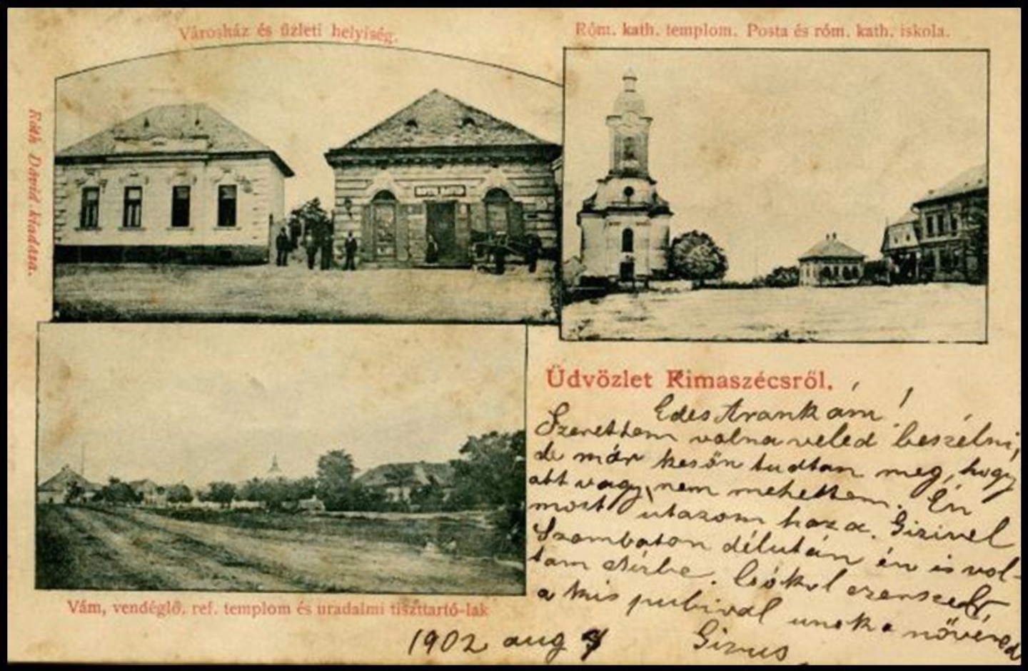 Róth Dávid kiadásában megjelent képeslapon a bal oldali leső kép a rimaszécsi városházát ábrázolja, Róth Dávid üzletével. A második jobboldali képen a római katolikus templom, posta, katolikus parókia és a katolikus iskola épülete látható. A bal alsó képen a főutca közepén található volt vámépület, vendéglő háttérben a református templommal, és mellette a Coburg uradalmi tiszttartó...Read More