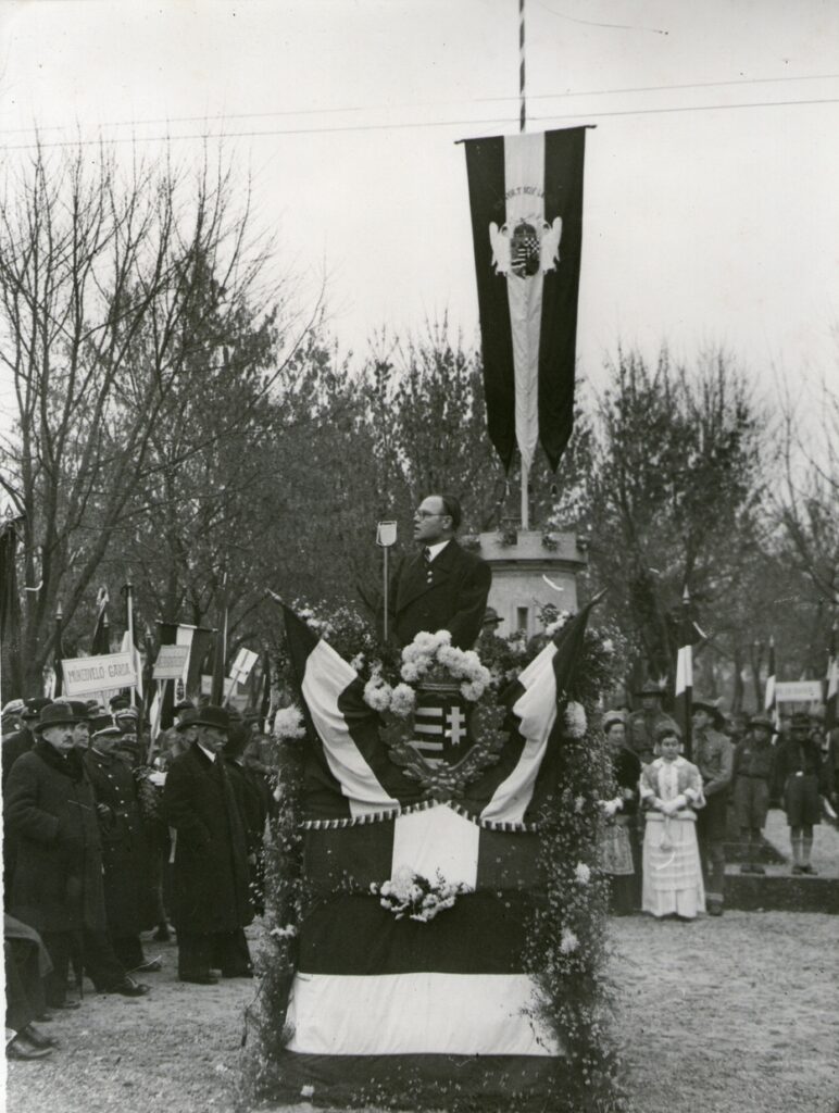 A dunaszerdahelyi Ereklyés Országzászló avatásán dr. Liptay Lajos kormányfőtanácsos mond ünnepi beszédet, 1939-ben