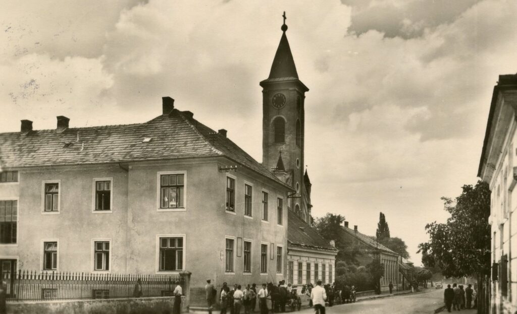 A dunaszerdahelyi Fő utca részlete az 1950-es évek elejéről. Az evangélikus templom mellett az evangélikus paplak, mellette a zsidó hitközség adminisztratív épülete, a „bócherkaszárnya” látható.