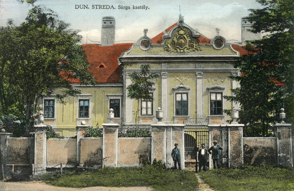 A dunaszerdahelyi Sárga kastély bejárata 1920-as évekbeli képeslapon. Izak Rimstein kiadása.