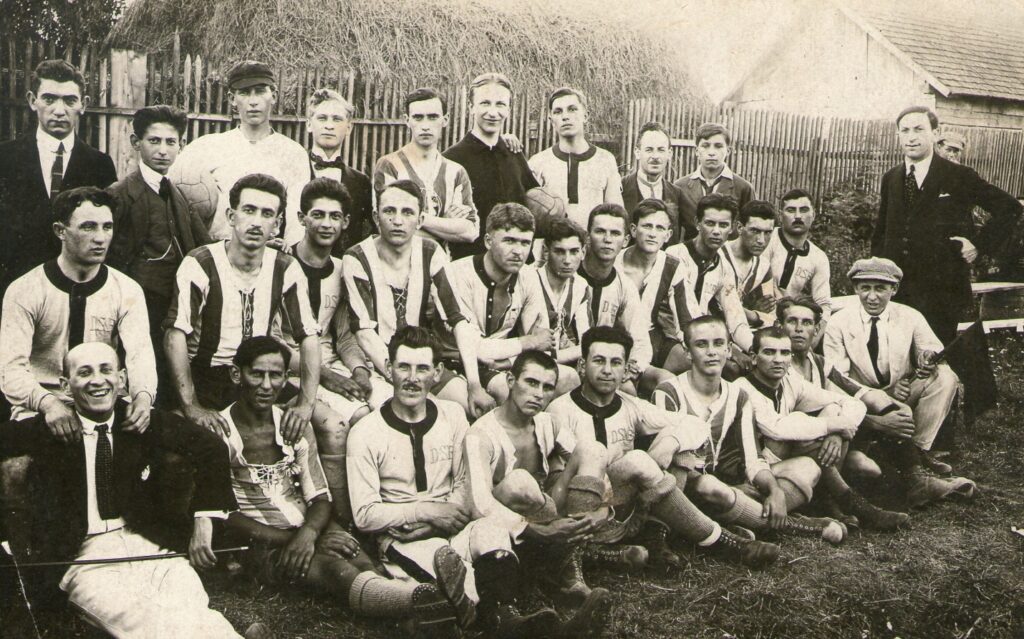 A Dunaszerdahelyi Sport Egyesület focicsapata 1919-ben a komáromiakkal játszott mérkőzés után. (Csíkosban a komáromiak). Brunner Adolf fotója. Az egylet Dunaszerdahely első sportegylete volt, amely 1908-ban alakult meg.