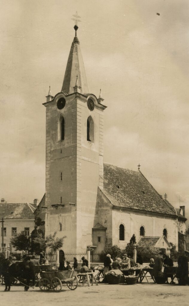 A dunaszerdahelyi Szent György-templom az 1930-as években, a templom előtt piacozókkal. A Fundárek papírüzlet kiadása.