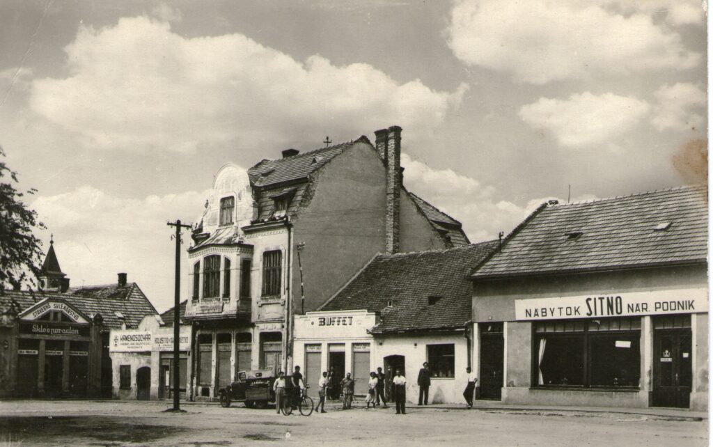 A dunaszerdahelyi Templom tér 1950-ben. A kép legnagyobb épülete az akkor még álló Vésey-ház. A pozsonyi TVAR kiadása.