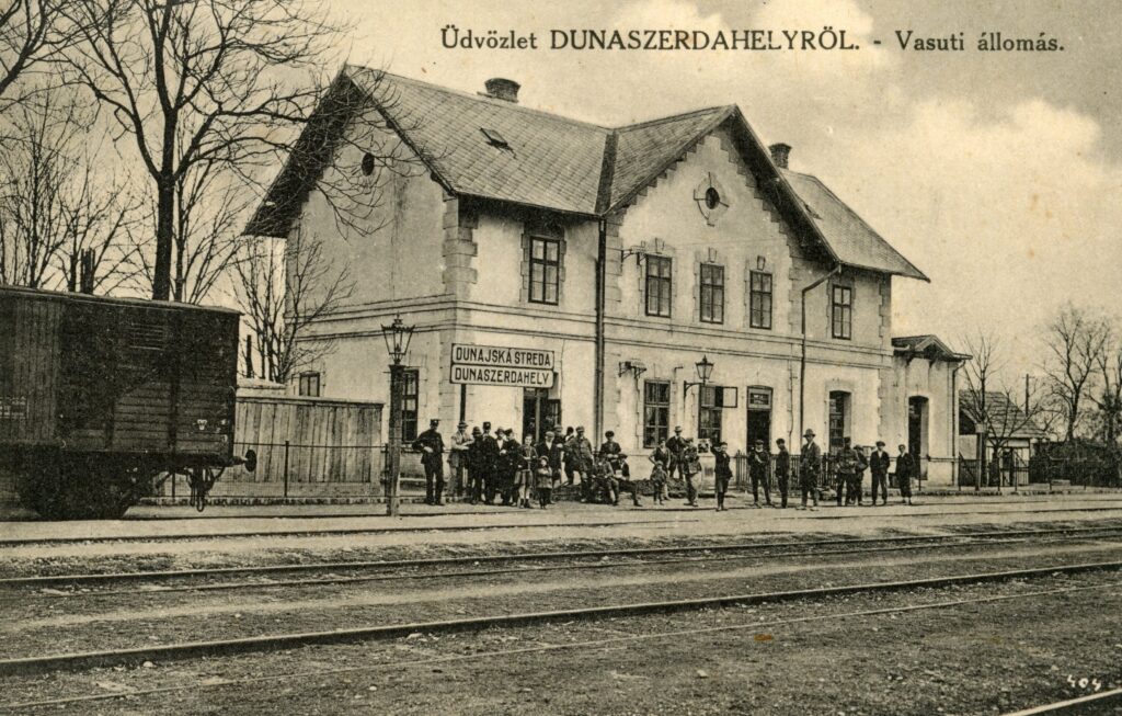 A dunaszerdahelyi vasútállomás az 1930-as évek derekán, kiadta Haar Henrik papírkereskedése, Brunner Ottó fotójával.