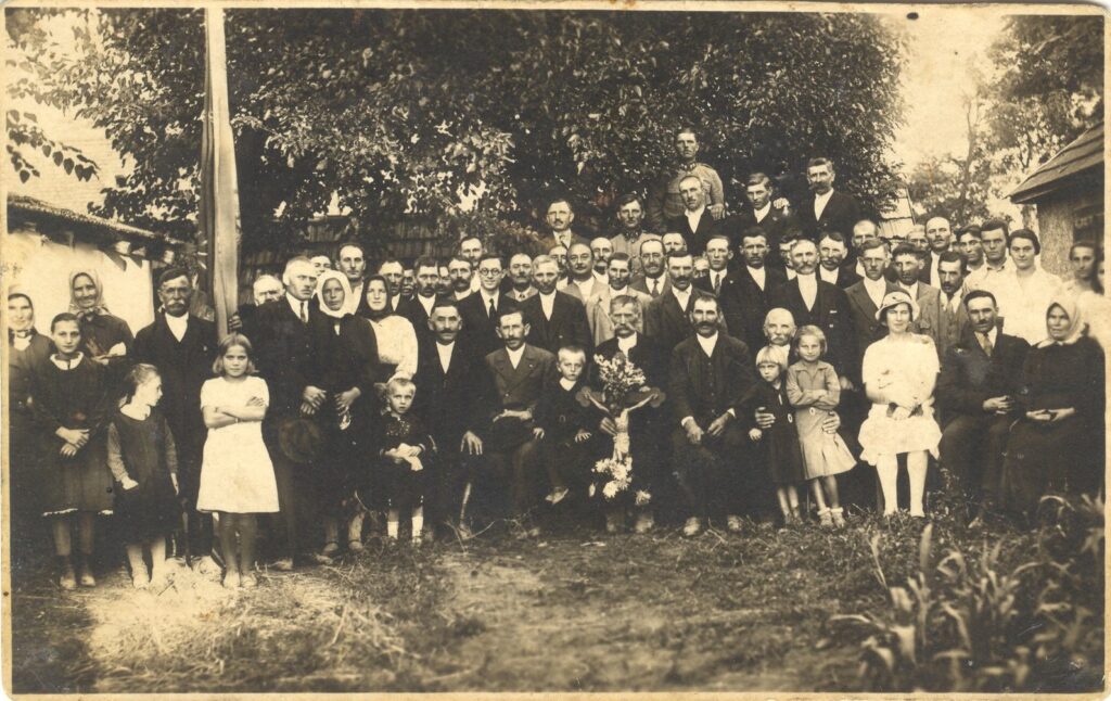 Gazdakör – Délnyugat-Szlovenszkói Gazdasági Egyesület – avatási ceremóniája. A képet feltehetően képeslapként adták ki (hátulján Post card nyomtatott felirat is olvasható. Kézzel feljegyzés, hogy a felvétel Szalva plébános szolgálata – 1911-1927 – alatt készült). Sümegh Ernő földbirtokos, aki elnöke volt az egyesületnek látható a felvételen. További személyek: Múdrák, Ballay Béla és neje. Ezt megelőzően a terület az épülettel kocsmaként is működött. (Ma itt található Teri néni hitoktató lakóháza.)