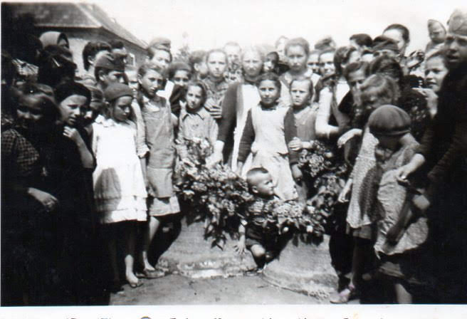 A harangokat a II. vh. idején (is) be kellett szolgáltatni, így a református templom harangját is. Soós Károly esperes elmondta a presbiteri gyűlésen 1943 márciusában, hogy a miniszteri rendelkezés szerint a harangokat 8 napon belül kell bejelenteni. A harangok búcsúztatására 1944. június 15-én került sor. A kép a ref. templom előtt készült, azt a helyzetet örökítette meg a fényképész (nevét nem ismerjük), amikor felvirágozták a toronyból leeresztett kb. 150 és 200 kg-os két kisebb harangot. Az egész falu búcsúzott tőlük. Az iskolások fontak köré élő koszorút. A képen levők között vannak: Pál Jolán, Kerekes Rozália, Kerekes Erzsébet, Erdélyi Erzsébet, Szabó Margit, Varga Ilona, Kiss Erzsébet, Tárnok Margit, a két harang között ül Dávid Lajos.