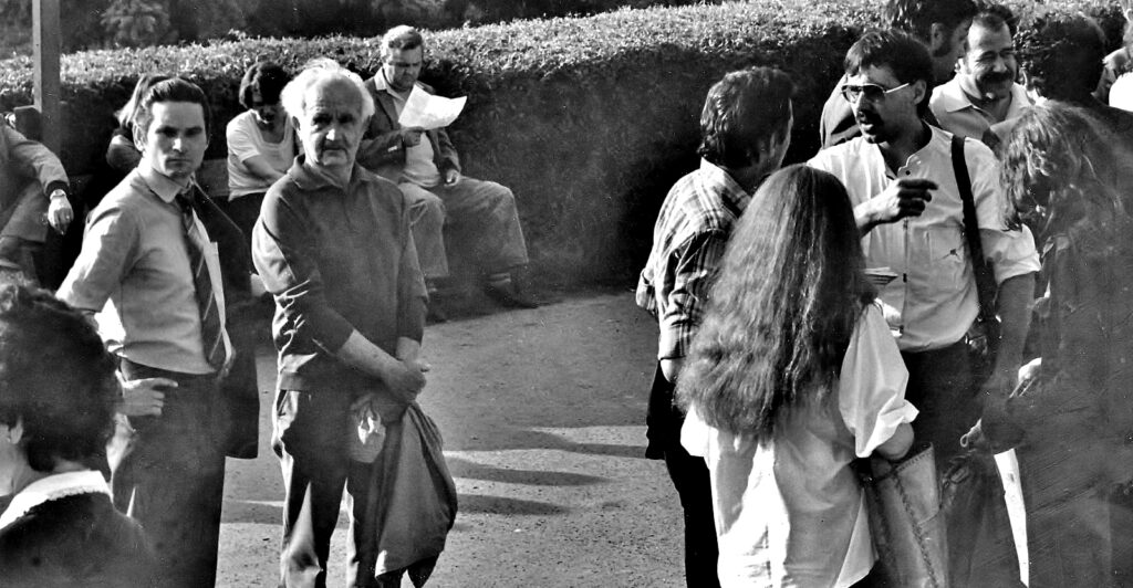 A szakszervezetek háza előtt balról: Pusztai József Királyhelmec mellől, Nagy László Léváról, Mihályi Molnár László Perbenyikről, Kiss Mihály Búcsról.