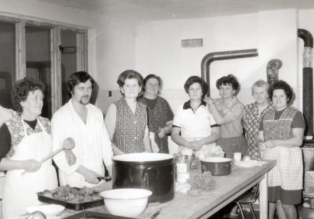 A szakácsnők és a szakács, a kultúrház konyhájában, valamelyik lakodalomban.
